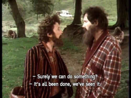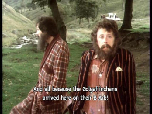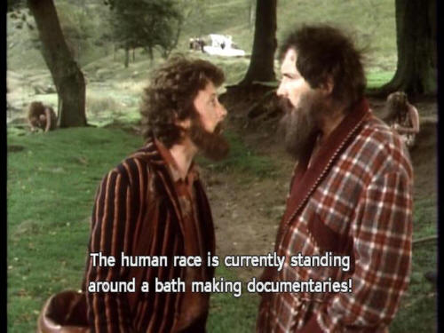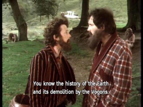 [Ford] The human race is currently standing around a bath making documentaries! [Arthur] Surely we can do something? [Ford] It's all been done, we've seen it. [Ford] You know the history of the Earth and its demolition by the Vogons. [Ford] You can't change anything. [Arthur] And all because the Golgafrinchans arrived here on their B Ark! [Ford] Ah, well. (CAVEMEN GRUNTING) |