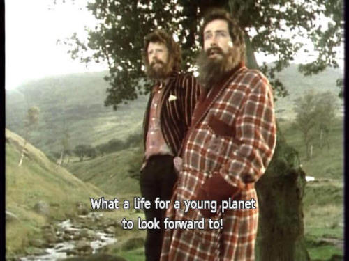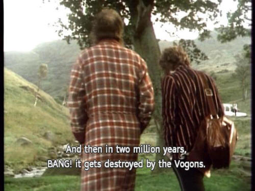 [Ford] It is. It is indeed. [Ford] The rich primal greens. [Ford] The river snaking off into the distance. [Ford] The burning forests. [Arthur] And then in two million years, BANG! it gets destroyed by the Vogons. [Arthur] What a life for a young planet to look forward to! |
