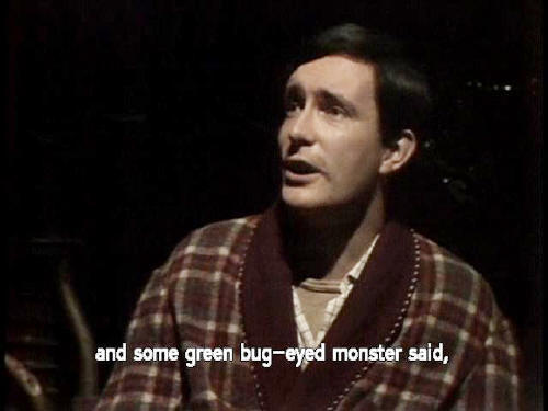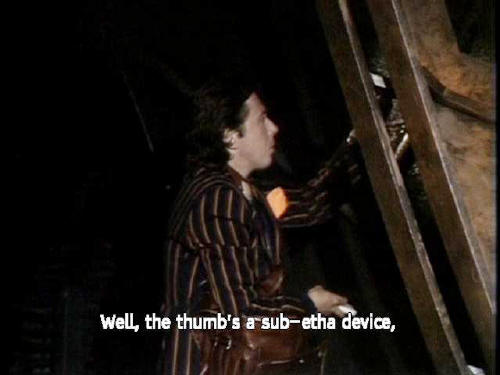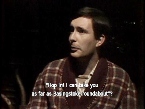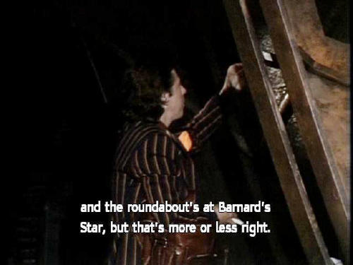 [Arthur] and some green bug-eyed monster said, [Arthur] "Hop in! I can take you as far as Basingstoke roundabout"? [Ford] Well, the thumb's a sub-etha device, [Ford] and the roundabout's at Barnard's Star, but that's more or less right. |