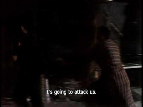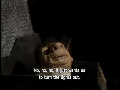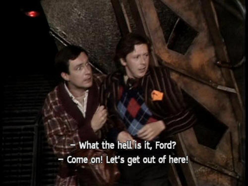 [Arthur] What the hell is it, Ford? [Ford] Come on! Let's get out of here! [Arthur] It's going to attack us. [Ford] No, no, no, it just wants us to turn the lights out. |