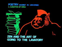 agrocrustles [Narrator] Vogon poetry is, of course, the third worst in the Universe. The second worst is that of the Azgoths of Kria. During a recitation by their poetmaster Grunthos the Flatulent of his poem: Ode to a Small Lump of Green Putty I found in my Armpit One Midsummer Morning, four of his audience died of internal haemorrhaging, and the president of the Mid-Galactic Arts Nobbling Council only survived by gnawing one of his own legs off. Grunthos is reported to have been disappointed by the poem's reception, and was about to embark on a reading of his 12-book epic entitled Zen and the Art of Going to the Lavatory when his own major intestine, in a desperate attempt to save lifekind, leapt straight up through his neck and throttled his brain. The very worst poetry of all, and its creator, Paula Nancy Millstone Jennings, of Greenbridge, Essex, England, perished in the destruction of the planet Earth. Vogon poetry is mild by comparison. (AGONISED MOANING)