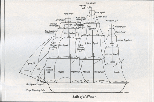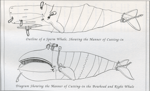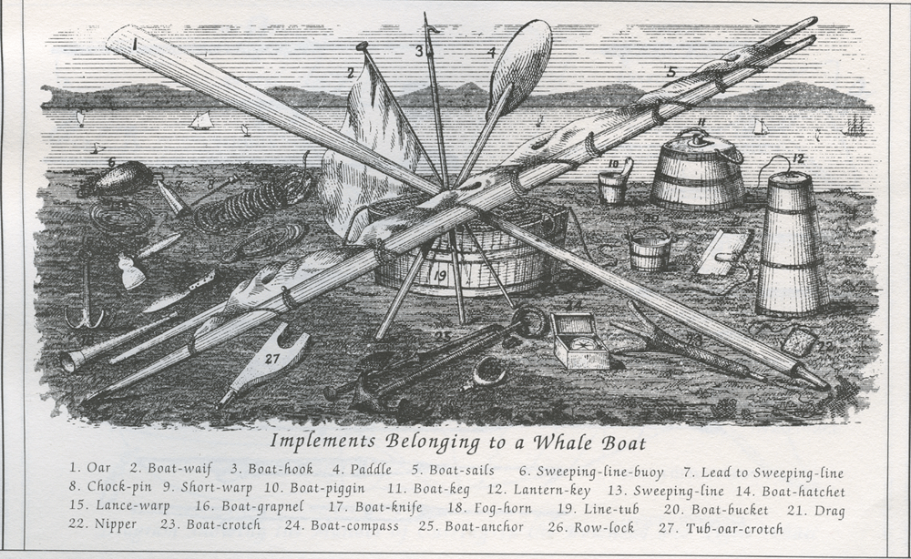 MAPS AND ILLUSTRATIONSTHE CRUISE OF THE PEQUOD Rigging and Cross-Section of a Whaler Sails of a Whaler Deck of a Whaler Implements Belonging to a Whale Boat: (1) Oar, (2) Boat-waif, (3) Boat-hook, (4) Paddle, (5) Boat-sails, (6) Sweeping-line-buoy, (7) Lead to Sweeping-line, (8) Chock-pin, (9) Short-warp, (10) Boat-piggin, (11) Boat-keg, (12) Lantern-key, (13) Sweeping-line, (14) Boat-hatchet, (15) Lance-warp, (16) Boat-grapnel, (17) Boat-knife, (18) Fog-horn, (19) Line-tub, (20) Boat-bucket, (21) Drag, (22) Nipper, (23) Boat-crotch, (24) Boat-compass, (25) Boat-anchor, (26) Row-lock, (27) Tub-oar-crotch Implements Used in Trying-out the Whale; Implements Used in Cutting-in a Whale Outline of a Sperm Whale Showing the Manner of Cutting-in; Diagram Showing the Manner of Cutting-in the Bowhead and Right Whale