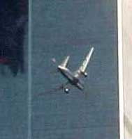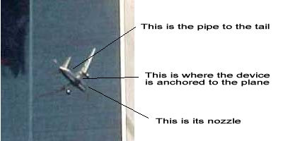 It concerns Flight 175, the jet which hit WTC2, the South Tower. If you have copies of the various shots of Flight 175 hitting WTC2 they're worth looking at again. In particular there's one bit of footage of this incident where the camera is facing the south side of WTC2, the side that took the impact. In this footage you can see the plane bank sharply seconds before impact and you can also see it actually penetrate the building. If you pause the tape just before it strikes you can see that the plane is carrying an anomalous device on its right wing, very close to the fuselage. It almost looks like a third engine and is connected by tubing to the tail section. The video (use your pause and frame forward buttons again) shows that, just as the plane's nose strikes the building this device fires a jet of flames, a split-second before the explosion starts. I wonder what this device can be? The dark stripe down the side is not part of the paintwork (check out the United Airlines livery) but the shadow of the device and its pipework. In the last second or two the plane banks so much to the left that the sun (to the right of the picture) catches the plane's underside and the mystery objects cast shadows. Start perhaps with the silvery 'lump' tucked, so to speak, in the plane's right 'armpit'. What is that? Note too that if you look closely, what I call the nozzle is not part of the plane's own outline but is separate from it. And on the video this nozzle can be seen firing a jet of flame, just before it penetrates the building.