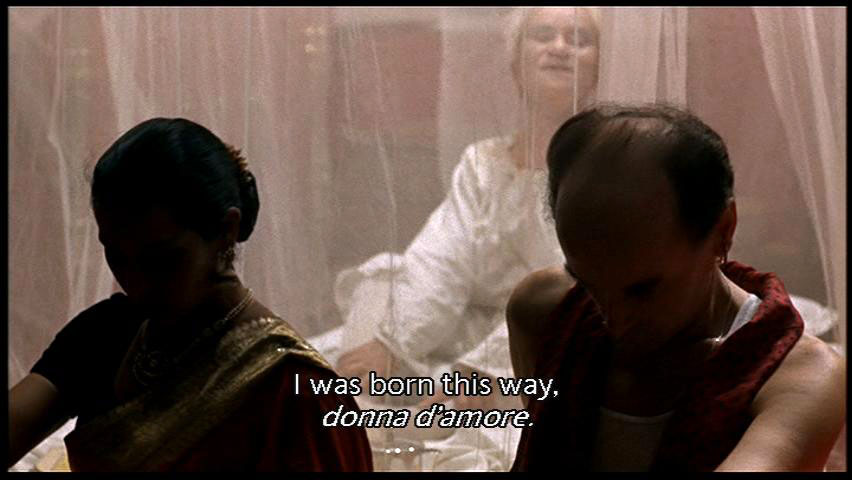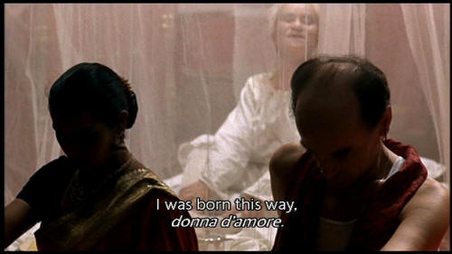 [Maestro] Learn to better please your husband. [Juliet] I do please him. [Maestro] Do you remember me? I was born this way, donna d'amore. Am I not beautiful? Answer honestly, am I not beautiful? [Juliet] Yes, very beautiful. Did you see my hair? |