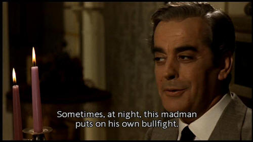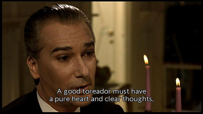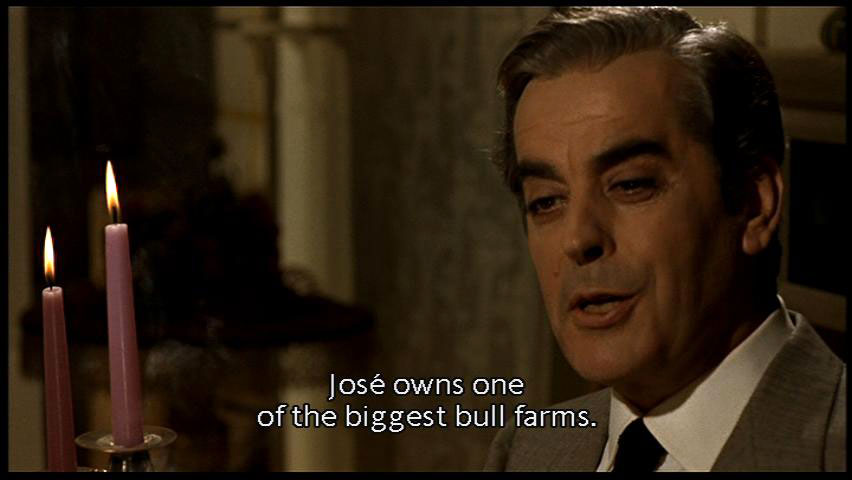 The balance. A good toreador must have a pure heart and clear thoughts, like monks or dancers. [Giorgio] Jose owns one of the biggest bull farms. Sometimes, at night, this madman puts on his own bullfight. [Juliet] What courage! Isn't it dangerous? |