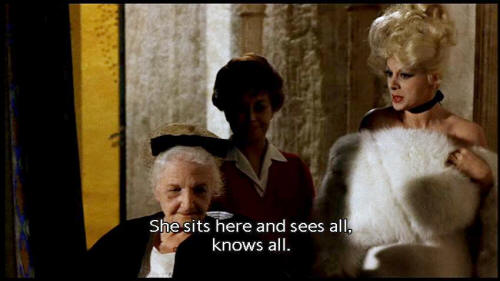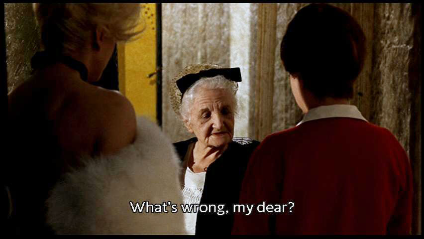 She sits here and sees all, knows all. Granny, this is Juliet. Do you like her? [Granny] What's wrong, my dear? [Suzy] I get spooked. She's a bit of a witch, too. She sees people and knows their secrets. [Granny] Everything passes.