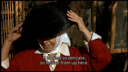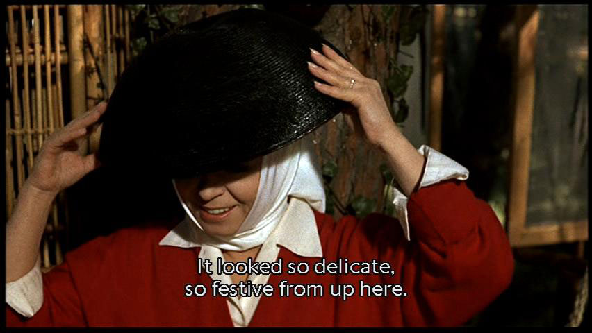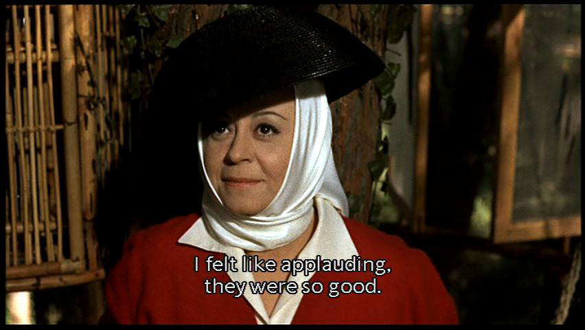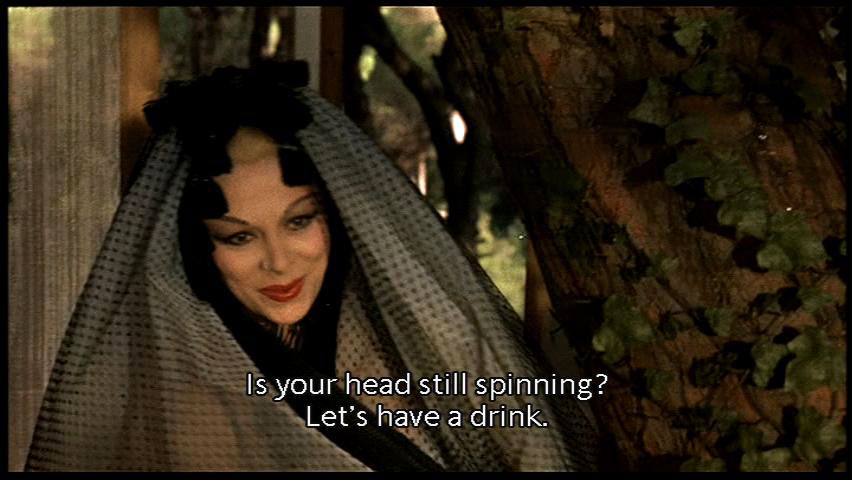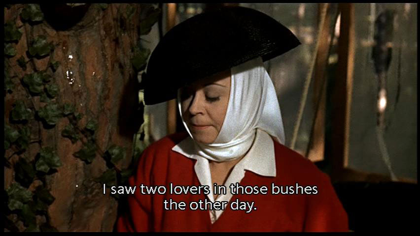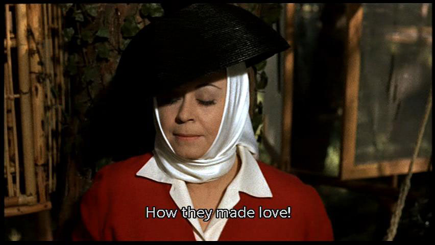 Didn't you notice? I saw two lovers in those bushes the other day. How they made love! I felt like applauding, they were so good. It looked so delicate, so festive from up here. Is your head still spinning? Let's have a drink. |