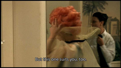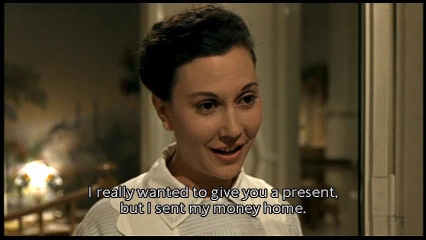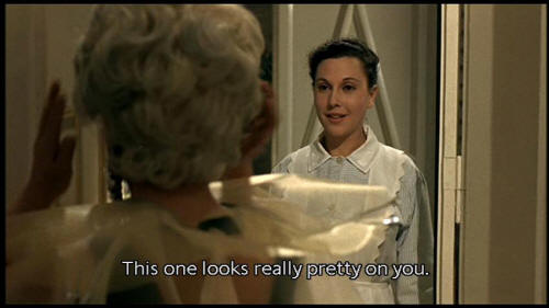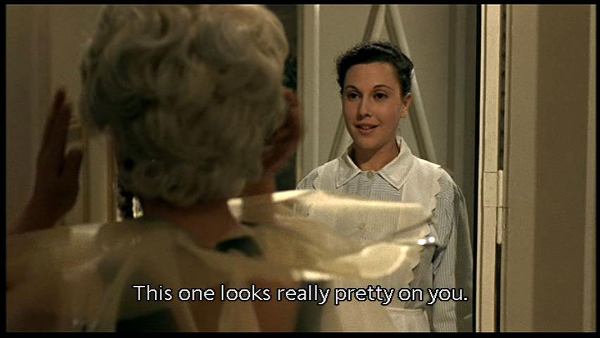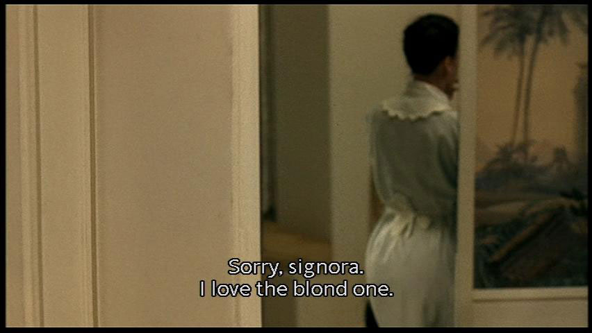 [Teresina] Sorry, Signora, I love the blond one. But this one suits you, too. What shoes, signora? [Juliet] I'm wearing them, Teresina! [Teresina] I really wanted to give you a present but I sent my money home. [Juliet] Never mind. Next time. [Teresina] This one looks really pretty on you. [Juliet] It doesn't! I look awful. I won't wear any. |