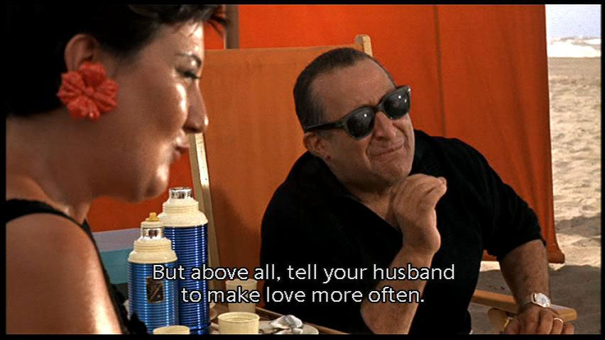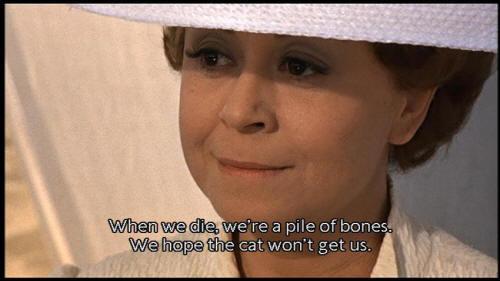 When we die, we're a pile of bones. We hope the cat won't get us. Take a swim, buy a horse, jump obstacles. But above all, tell your husband to make love more often. Nothing's better for toothaches and spirits. [Juliet] Yes, I know. |