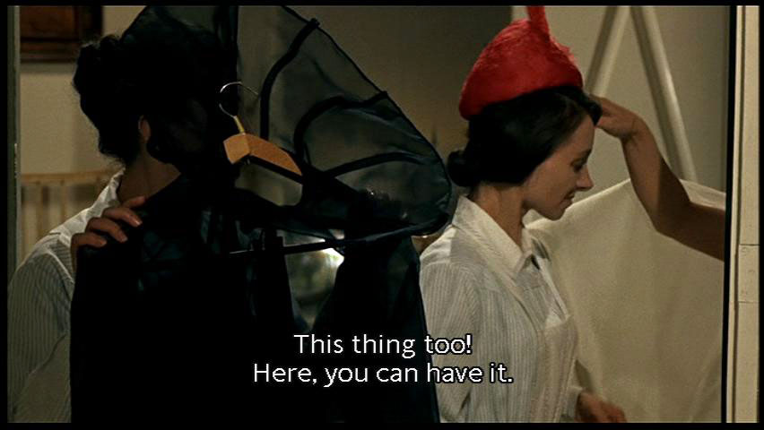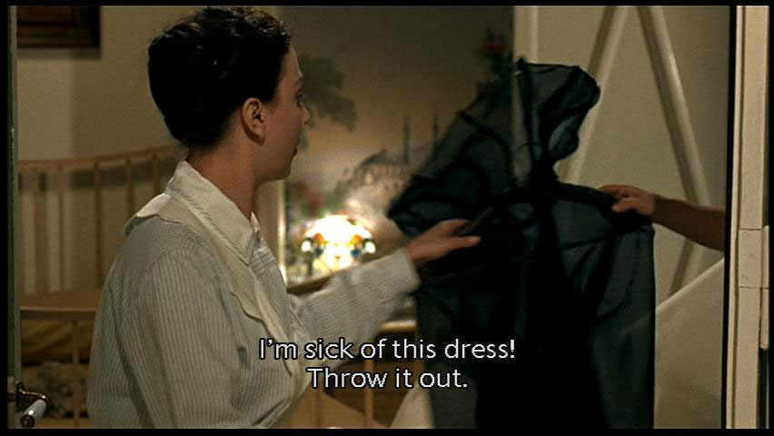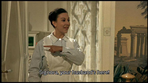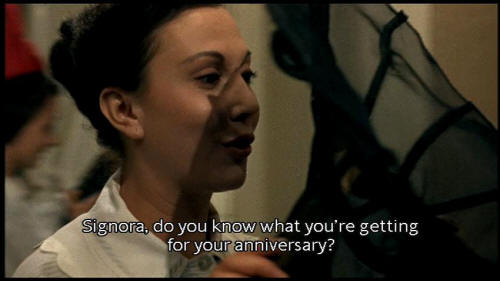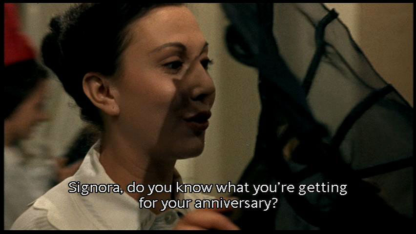 I'm sick of this dress! Throw it out. This thing too! Here, you can have it. [Teresina] Signora, do you know what you're getting for your anniversary? Your gift for him is so beautiful. Signora, your husband's here! Get off the bed, you! |