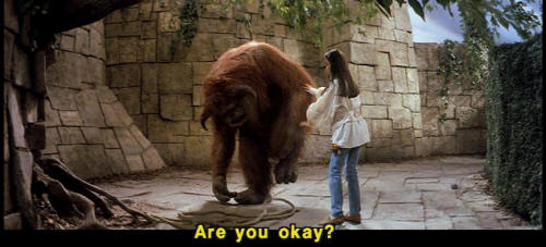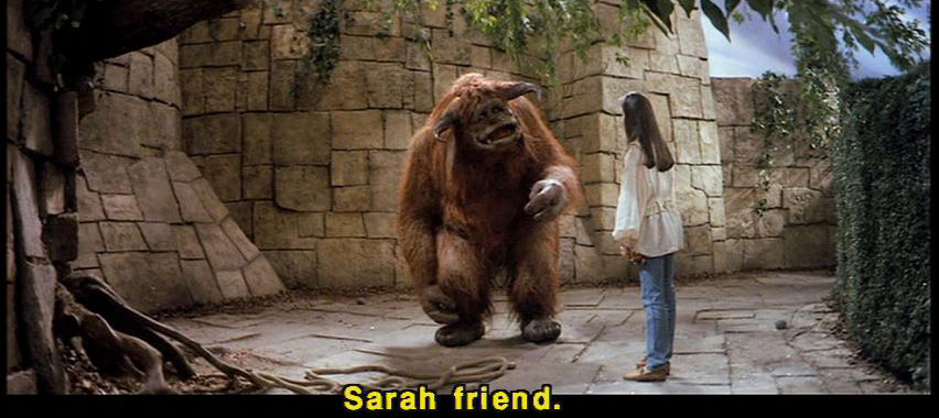 [Sarah] Are you okay? [Ludo] Sarah friend. [Sarah] Now, wait. Just a second. [Sarah] I want to ask you something, Ludo. [Ludo] What? [Sarah] I have to get to the castle at the labyrinth's center. Do you know the way? [Ludo] No. [Sarah] You don't know either, huh? [Sarah] I wonder if anyone knows how to get through this labyrinth. |