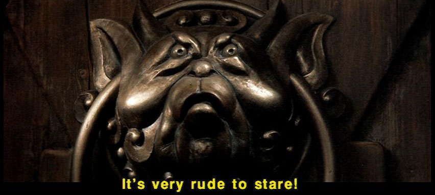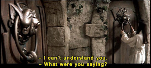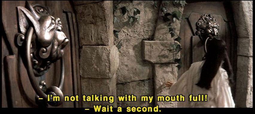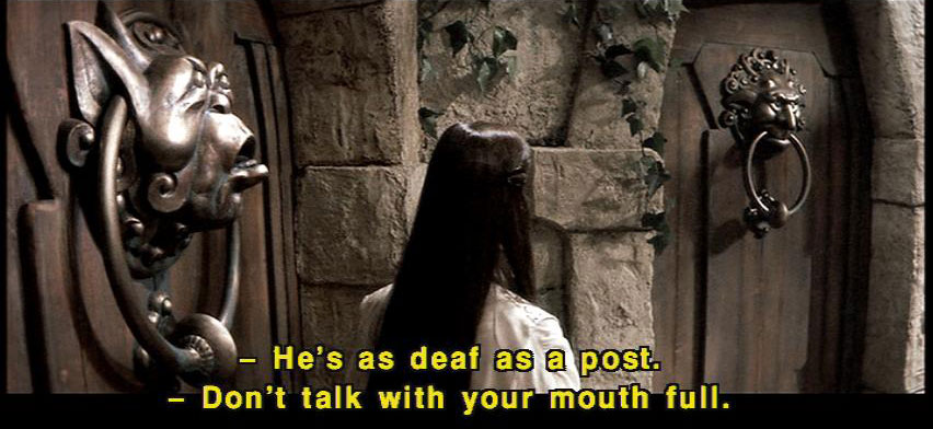 [Knocker] It's very rude to stare! [Sarah] I'm sorry. I was just wondering which door to choose. [Knocker] What? [Knocker] It's no good asking him. [Knocker] He's as deaf as a post. [Knocker] Don't talk with your mouth full. [Knocker] I'm not talking with my mouth full! [Sarah] Wait a second. [Sarah] I can't understand you. What were you saying? |