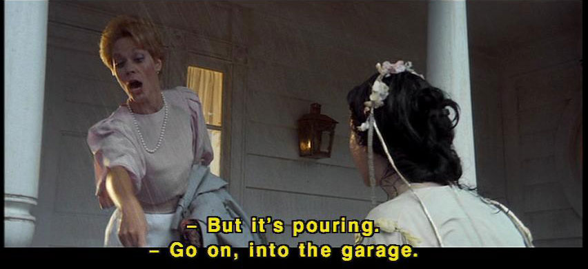 [Sarah] All right. Come on, Merlin. [Sarah] Come on. [Wicked Stepmother] Not the dog. [Sarah] But it's pouring. [Wicked stepmother] Go on, into the garage. [Sarah] Go on, Merlin. Go into the garage. [Sarah] Go. [Wicked Stepmother] Sarah, you're an hour late. [Sarah] I said I was sorry! [Wicked Stepmother] Please let me finish. [Wicked Stepmother] Your father and I go out rarely. [Sarah] You go out every single weekend. |
