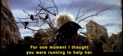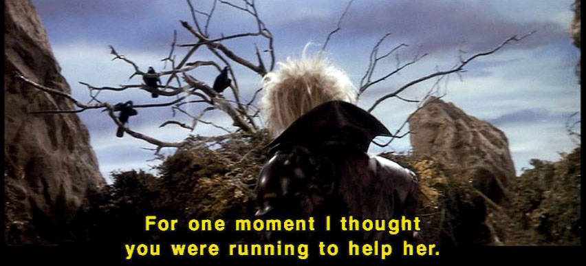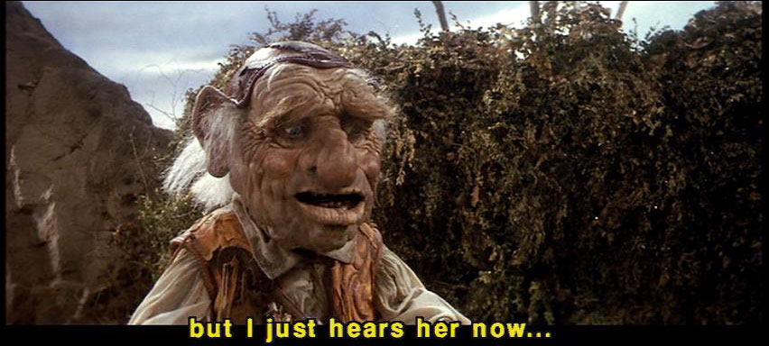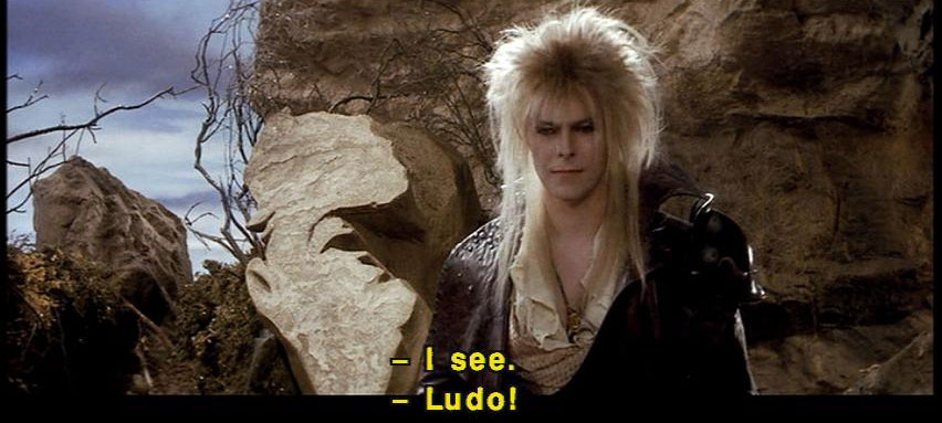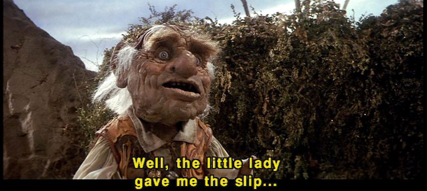 [Hoggle] Well, the little lady gave me the slip ... [Hoggle] but I just hears her now ... [Hoggle] so I was about to lead her back to the beginning ... [Hoggle] like you told me. [Jareth] I see. [Sarah] Ludo! [Jareth] For one moment I thought you were running to help her. [Jareth] But no, not after my warnings. |