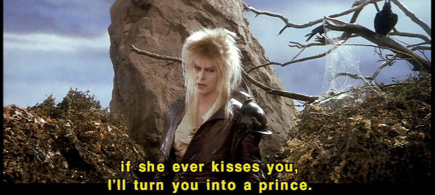 [Jareth] And Hoggle ... [Jareth] if she ever kisses you, I'll turn you into a prince. [Hoggle] You -- You will? [Jareth] Prince of the Land of Stench. [Sarah] Ludo? [Sarah] What's going on? |
