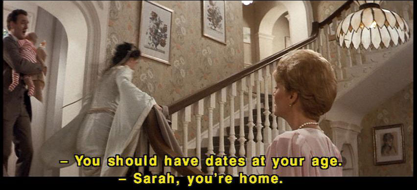 [Wicked Stepmother] I ask you to baby-sit only if it won't interfere with your plans. [Sarah] You don't know what my plans are. You don't even ask me anymore. [Wicked Stepmother] I assume you'd tell me you had a date. I'd like it if you had a date. [Wicked Stepmother] You should have dates at your age. [Father] Sarah, you're home. [Father] We were worried about you. [Sarah] I can't do anything right, can I? [Wicked Stepmother] She treats me like a wicked stepmother in a fairy story no matter what I say. [Father] I'll talk to her. |