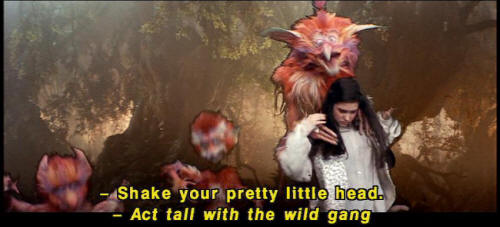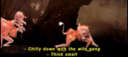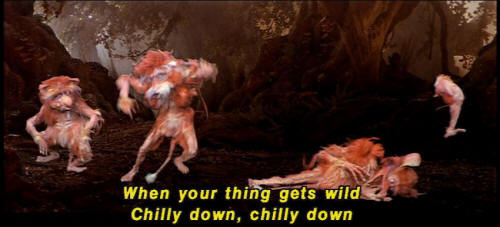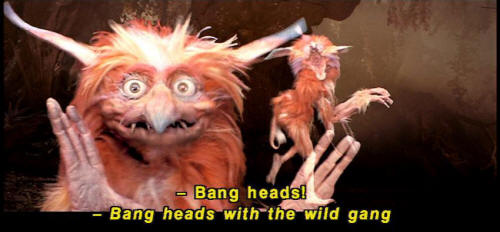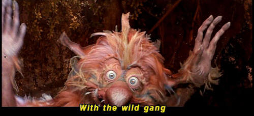 [Goblin] Chilly down with the wild gang [Goblin] Think small [Goblin] Think small with the wild gang [Goblin] Bang heads! [Goblin] Bang heads with the wild gang [Goblin] Hey, listen up. [Goblin] When your thing gets wild, Chilly down, chilly down [Goblin] With the wild gang [Goblin] Shake your pretty little head. [Goblin] Act tall with the wild gang [Goblin] Tap your pretty little feet. [Goblin] Good times, bad food |