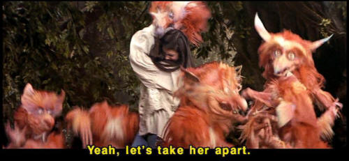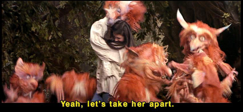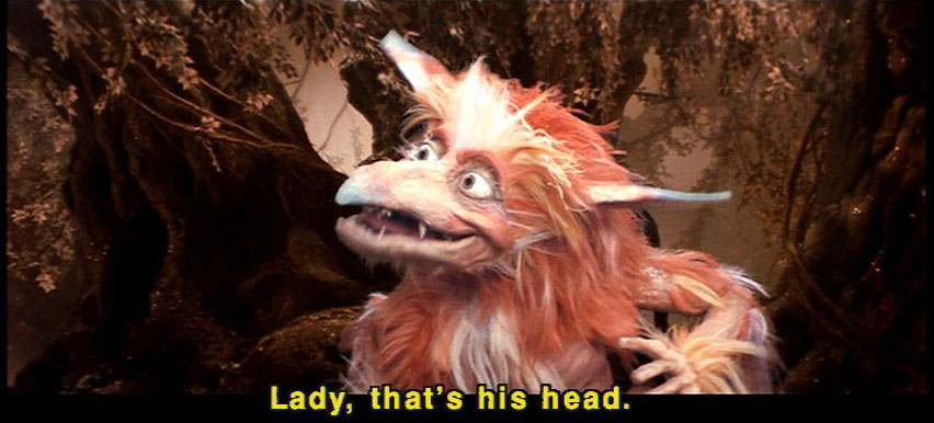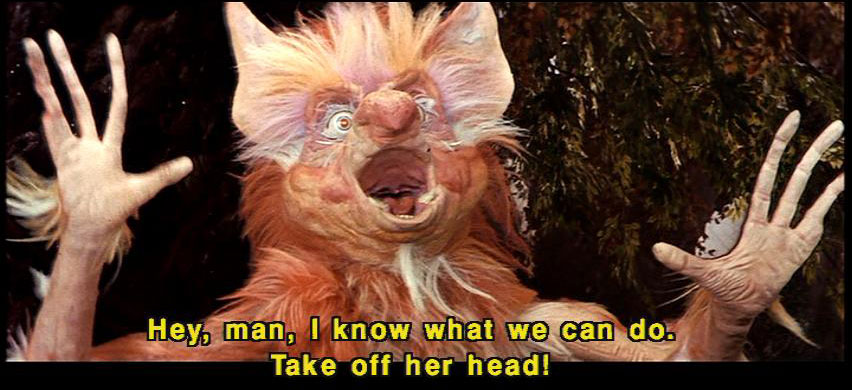 [Goblin] Come on! [Goblin] Hey, hey! Her head don't come off. [Goblin] Of course it doesn't! [Goblin] She's right. It's stuck on. [Goblin] Hey, lady. [Goblin] Where you going with a head like that? [Goblin] Hey, man, I know what we can do. Take off her head! [Goblin] Yeah, let's take her apart. [Goblin] Lady, that's his head. |