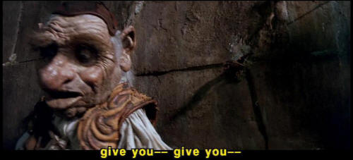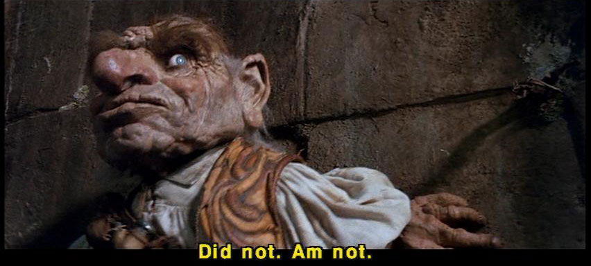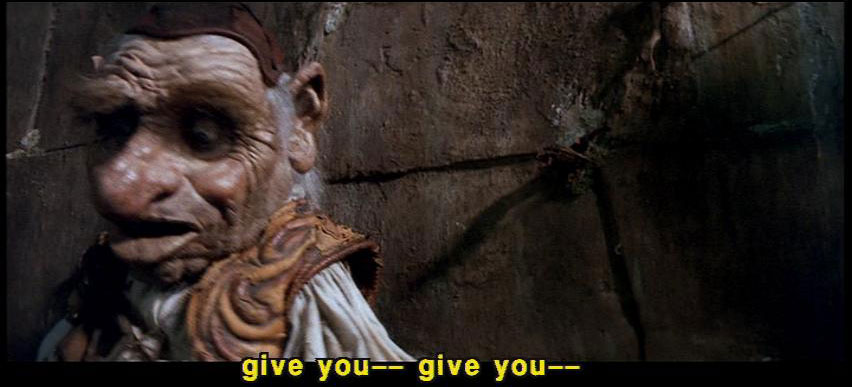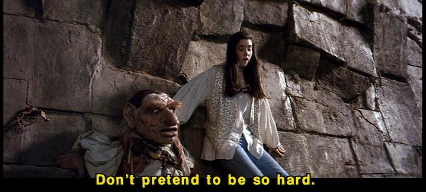 [Sarah] Oh, my gosh. [Sarah] Don't pretend to be so hard. [Sarah] I know you came back to help me, and I know that you're my friend. [Hoggle] Did not. Am not. [Hoggle] I just come to get me property back. [Hoggle] Oh, and ... [Hoggle] give you -- give you -- [Sarah] Give me what? |