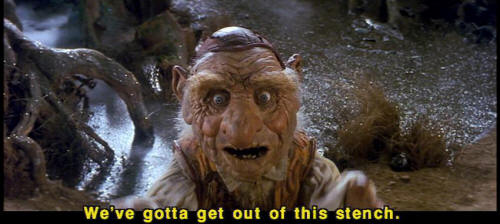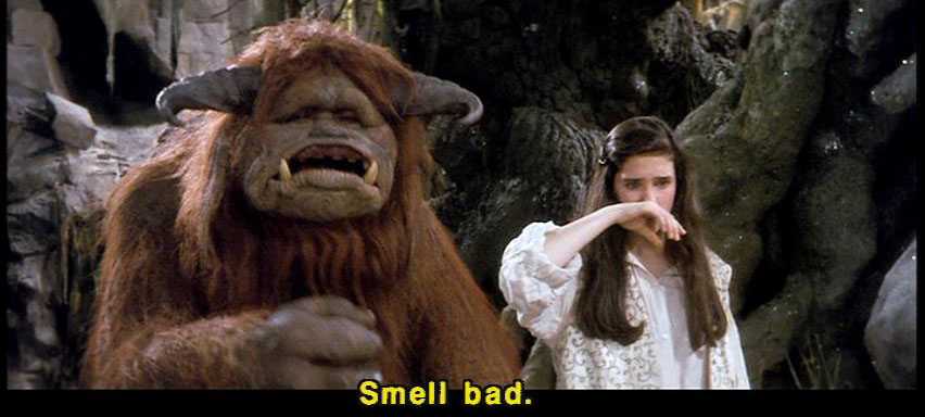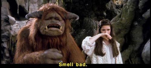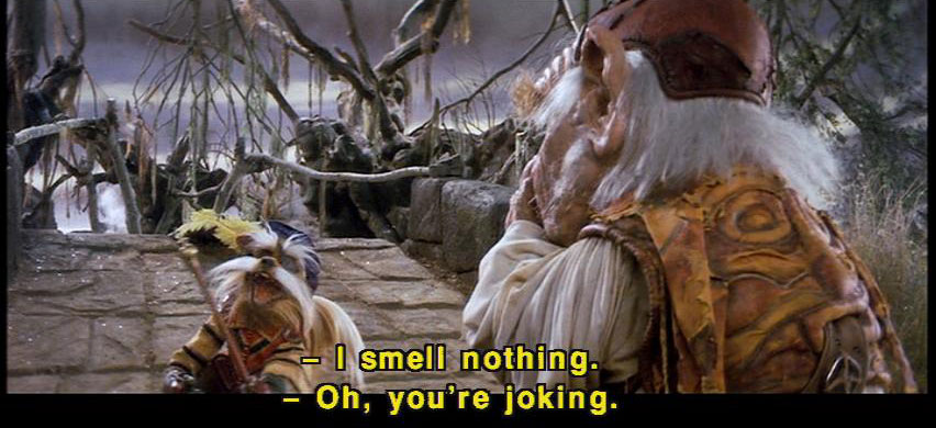 [Hoggle] We've gotta get out of this stench. [Ludo] Smell bad. [Sir Didymus] Stench? Of what speaketh thou? [Sarah] This smell. [Sir Dydmus] I smell nothing. [Hoggle] Oh, you're joking. [Sir Didymus] But I live by my sense of smell. [Sir Didymus] The air is sweet and fragrant, and none may pass without my permission! [Ludo] Smell bad. |