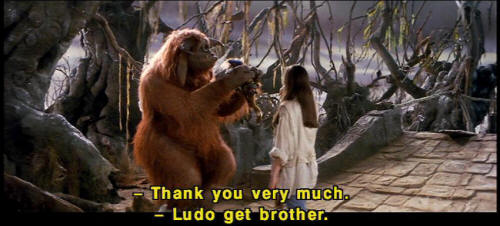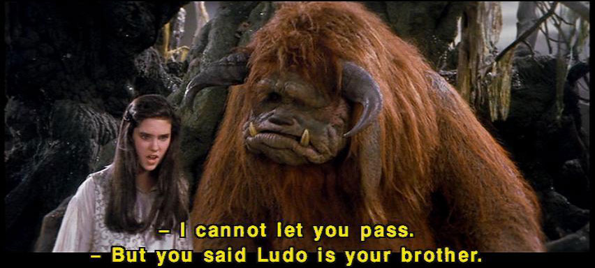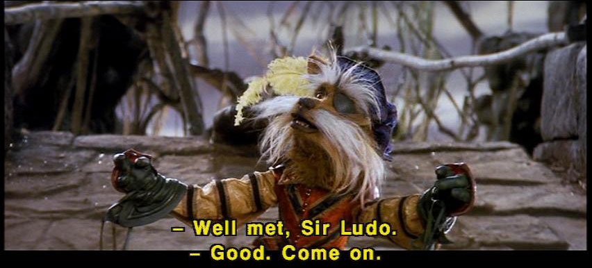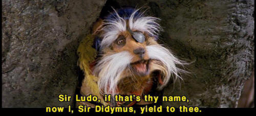 [Sir Didymus] Sir Ludo, if that's thy name, now I, Sir Didymus, yield to thee. [Sir Didymus] Come, let us be brothers henceforth ... [Sir Didymus] and fight for the right as one! [Sir Didymus] Thank you very much. [Ludo] Ludo get brother. [Sir Didymus] Steady. [Sir Didymus] Well met, Sir Ludo. [Sarah] Good. Come on. [Sir Didymus] Wait a minute! You forget my sacred vow, my lady. [Sir Didymus] I cannot let you pass. [Sarah] But you said Ludo is your brother. |