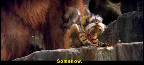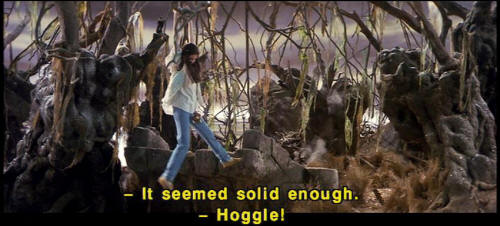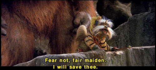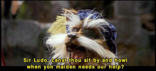 [Sir Didymus] It seemed solid enough. [Sarah] Hoggle! [Sir Didymus] Fear not, fair maiden. I will save thee. [Sir Didymus] Somehow. [Sir Didymus] Sir Ludo, canst thou sit by and howl when yon maiden needs our help? |