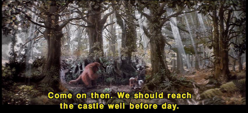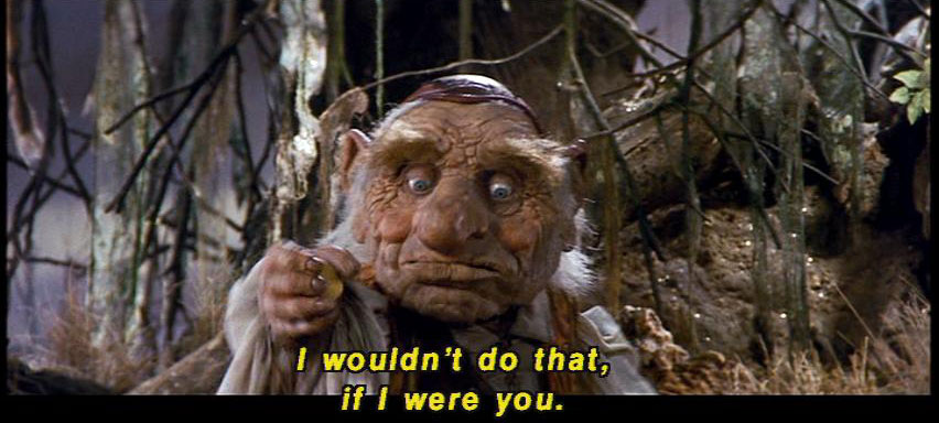 [Jareth] I wouldn't do that, if I were you. [Hoggle] Oh, please, I can't give it to her. [Sir Didymus] Come on then. We should reach the castle well before day. |