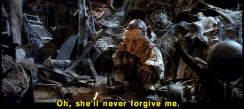 [Hoggle] Oh, she'll never forgive me. [Hoggle] What have I done? |