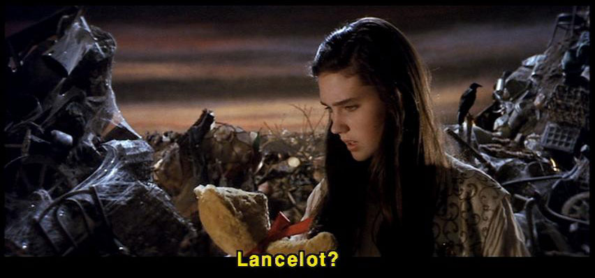[Junk Lady] You can't look where you're going if you don't know where you're going. [Sarah] I was searching for something. [Junk Lady] Look here. [Sarah] Lancelot? [Sarah] Thank you. [Junk Lady] That's what you were looking for, wasn't it, my dear? [Sarah] Yes. I forgot. |