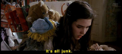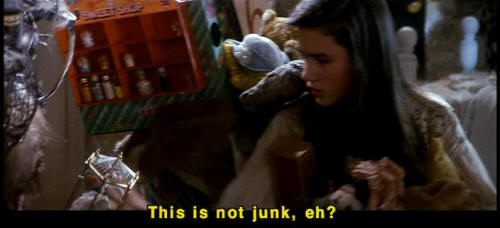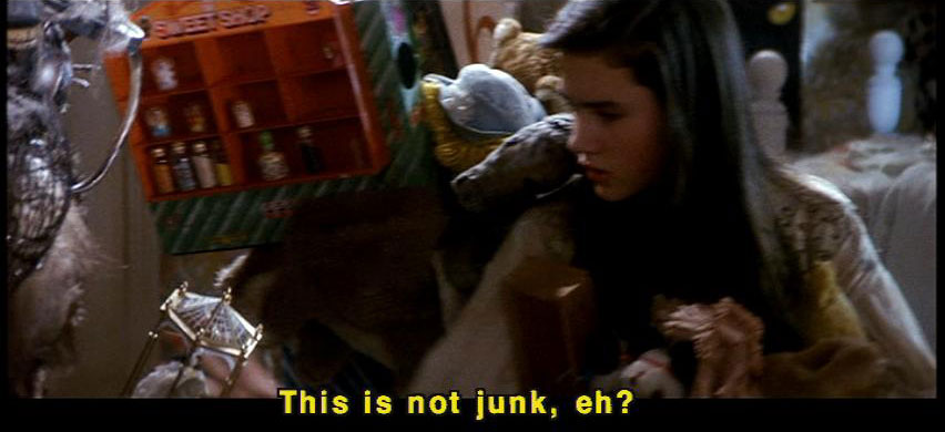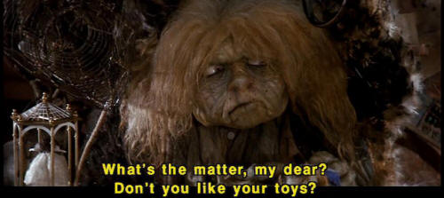 [Sarah] to take back the child that you have stolen." [Junk Lady] What's the matter, my dear? Don't you like your toys? [Sarah] It's all junk. [Junk Lady] Well, what about this? [Junk Lady] This is not junk, eh? [Sarah] Yes, it is! [Sarah] I have to save Toby! |