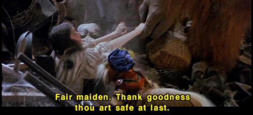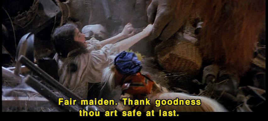 [Sir Didymus] My lady! [Sir Didymus] Are you all right? [Sir Didymus] Fair maiden. Thank goodness thou art safe at last. |