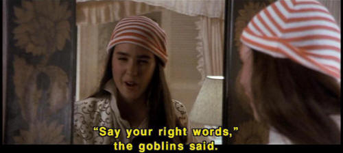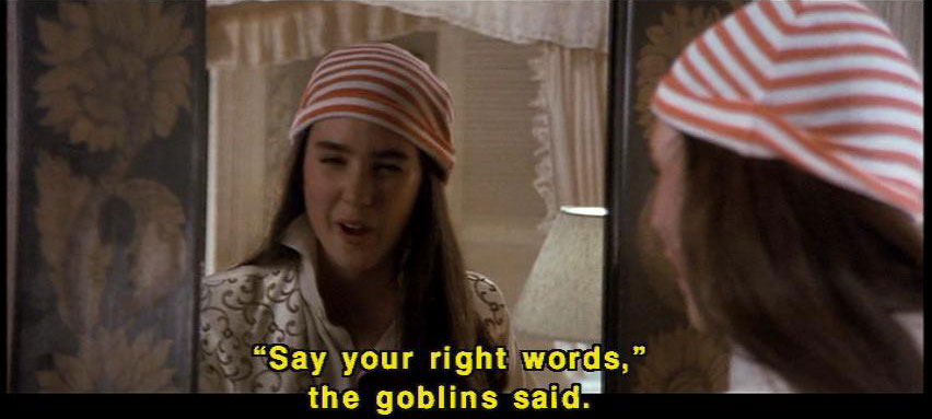 [Goblin] Listen. [Sarah] "Say your right words," the goblins said. [Sarah] "And we'll take the baby to the Goblin City ... [Sarah] and you will be free." |