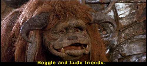 [Sarah] I forgive you. [Hoggle] You -- You do? [Sir Didymus] And I commend you. Rarely have I seen such courage. [Sir Didymus] You are a valiant man, Sir Hoggle. [Hoggle] I am? [Ludo] Yeah. [Ludo] Hoggle and Ludo friends. [Hoggle] We are? [Ludo] Yeah. |