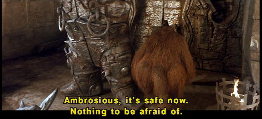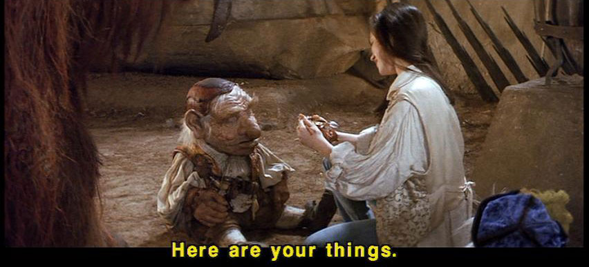 [Sarah] Here are your things. [Sarah] Thanks for your help. [Hoggle] Well, what are we waiting for? [Hoggle] Let's get the rat who calls himself Jareth. [Sarah] Right. Come on. [Sir Didymus] Ambrosious, it's safe now. Nothing to be afraid of. |
