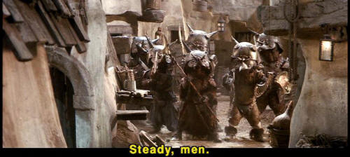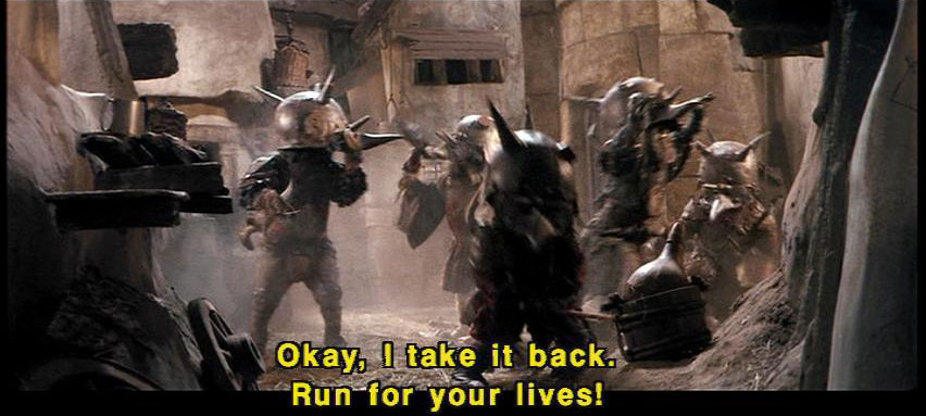 [Goblin] Good grief! [Goblin] Steady, men. [Goblin] Steady, men. Hold your ground. [Goblin] Okay, I take it back. Run for your lives! [Goblin] I've had enough! I'm going to bed. |