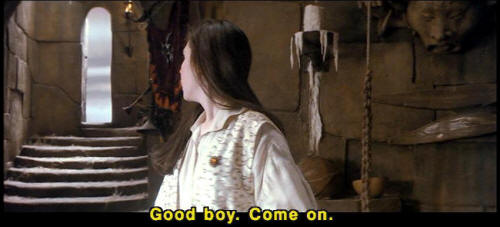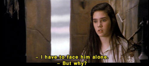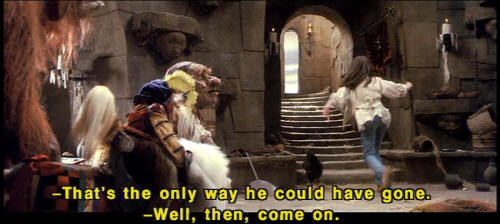 [Sarah] No. [Sir Didymus] Good boy. Come on. [Sarah] That's the only way he could have gone. [Sir Didymus] Well, then, come on. [Sarah] I have to face him alone. [Sir Didymus] But why? [Hoggle] Yes, why? [Sarah] Because that's the way it's done. |