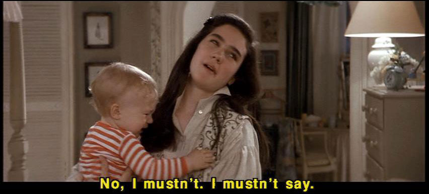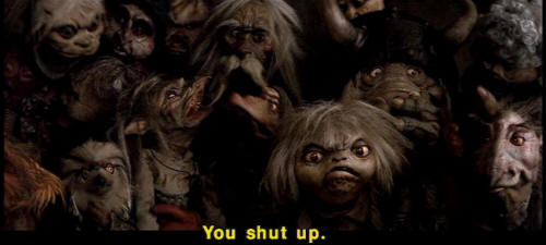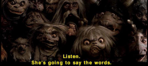 [Sarah] No, I mustn't. I mustn't say. [Sarah] I wish -- [Sarah] I wish -- [Goblin] She's going to say it. [Goblin] Say what? [Goblin] Shut up. [Goblin] Sorry. [Goblin] You shut up. [Goblin] Listen. She's going to say the words. [Sarah] I can bear it no longer! |