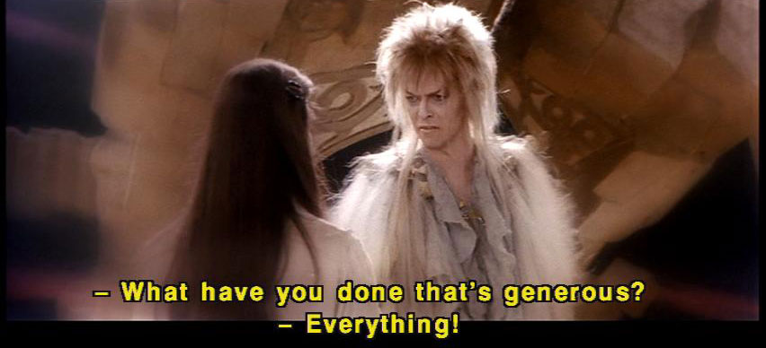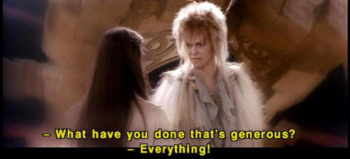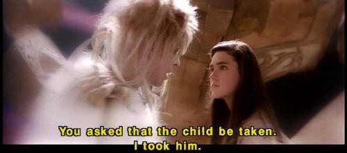 [Jareth] Sarah, beware. [Jareth] I have been generous up until now, and I can be cruel. [Sarah] Generous? [Sarah] What have you done that's generous? [Jareth] Everything! [Jareth] Everything that you have wanted, I have done. [Jareth] You asked that the child be taken. I took him. |