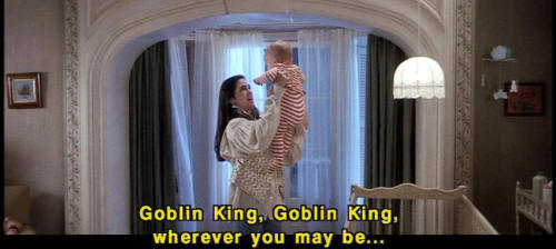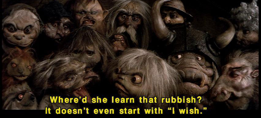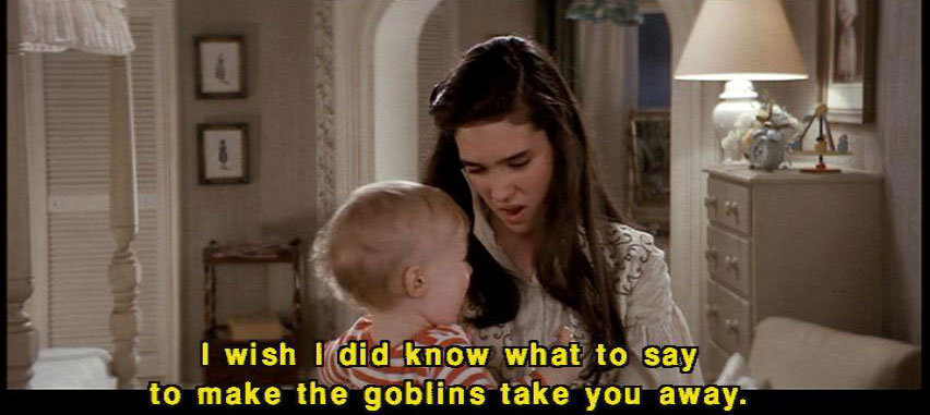 [Sarah] Goblin King, Goblin King, wherever you may be ... [Sarah] take this child of mine far away from me! [Goblin] No! [Goblin] That's not it. [Goblin] Where'd she learn that rubbish? It doesn't even start with 'I wish." [Sarah] Toby, stop it! [Sarah] I wish I did know what to say to make the goblins take you away. |