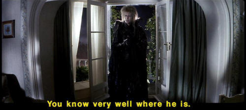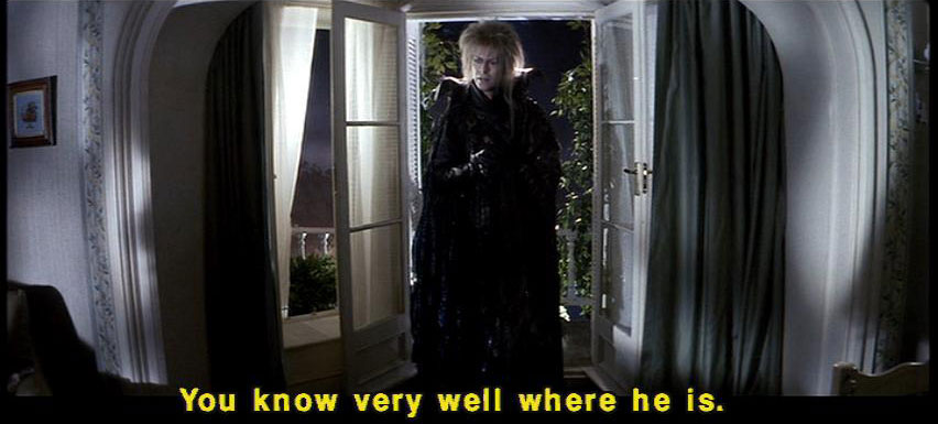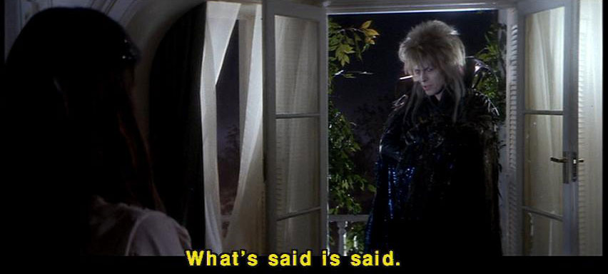 [Sarah] I want my brother back, please, if it's all the same. [Jareth] What's said is said. [Sarah] But I didn't mean it. [Jareth] Oh, you didn't. [Sarah] Please. [Sarah] Where is he? [Jareth] You know very well where he is. [Sarah] Please bring him back. Please. [Jareth] Sarah ... |