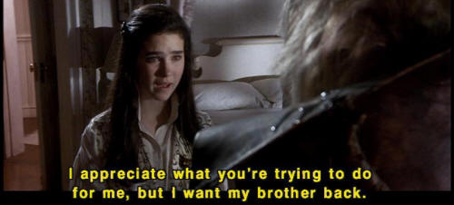[Sarah] I appreciate what you're trying to do for me, but I want my brother back. [Sarah] He must be so scared. [Jareth] Sarah. [Jareth] Don't defy me. |