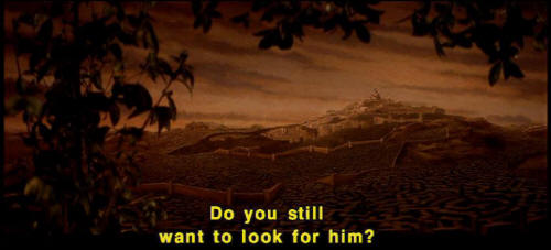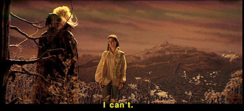 [Jareth] He's there, in my castle. [Jareth] Do you still want to look for him? [Sarah] Is that the castle beyond the Goblin City? [Jareth] Turn back, Sarah. Turn back before it's too late. [Sarah] I can't. |