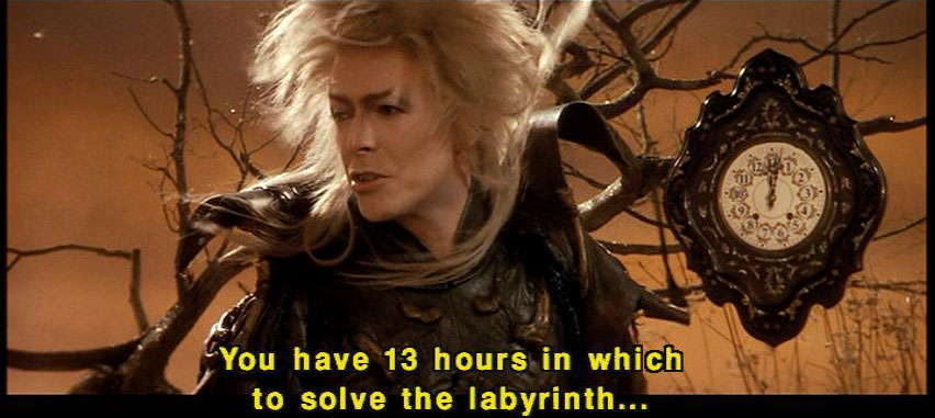 [Sarah] Don't you understand that I can't? [AB-1] [Jareth] What a pity. [Sarah] It doesn't look that far. [Jareth] It's further than you think. Time is short. [Jareth] You have 13 hours in which to solve the labyrinth ... |