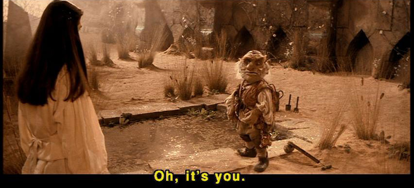 [Sarah] Excuse me? [Hoggle] Oh, excuse me! [Hoggle] Oh, it's you. [Sarah] Excuse me, but I have to get through this labyrinth. Can you help me? [Sarah] Oh, how sweet. |