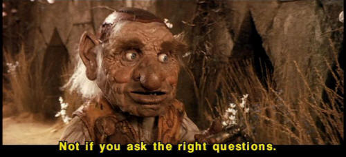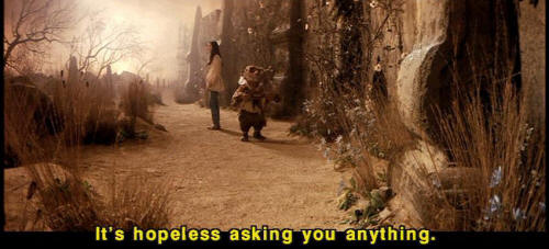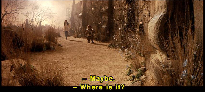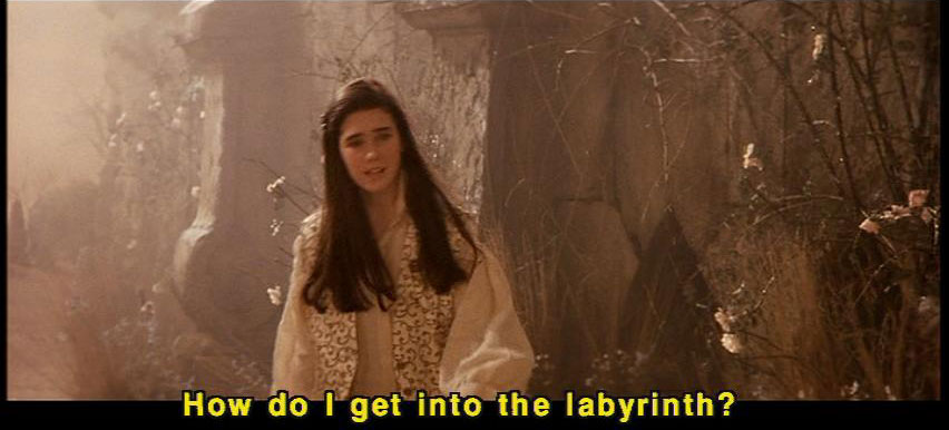 [Hoggle] Maybe. [Sarah] Where is it? [Hoggle] Oh, you little -- [Hoggle] Sixty! [Sarah] I said, where is it? [Hoggle] Where is what? [Sarah] The door. [Hoggle] What door? [Sarah] It's hopeless asking you anything. [Hoggle] Not if you ask the right questions. [Sarah] How do I get into the labyrinth? |