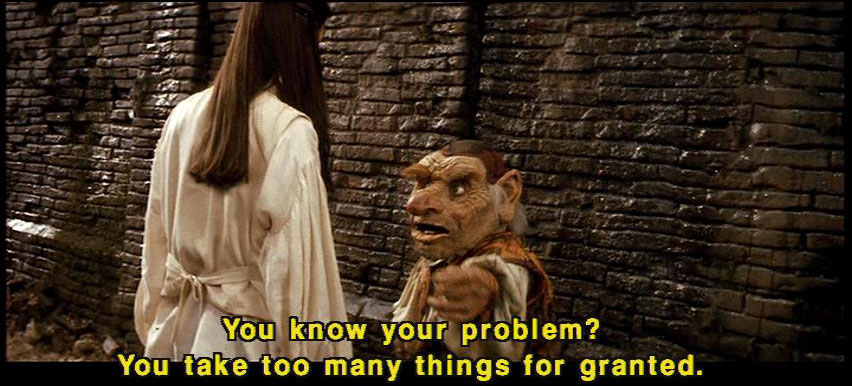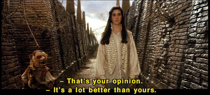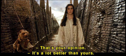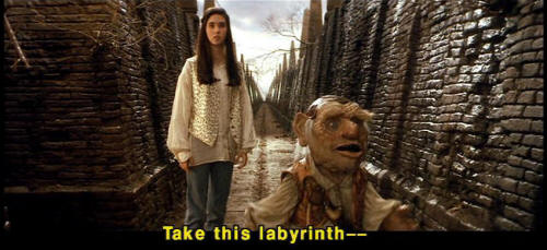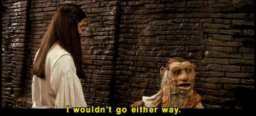 [Sarah] Which way would you go? [Hoggle] Me? [Hoggle] I wouldn't go either way. [Sarah] If that's all the help you're gonna be, you can just leave. [Hoggle] You know your problem? You take too many things for granted. [Hoggle] Take this labyrinth -- [Hoggle] Even if you get to the center, you'll never get out again. [Sarah] That's your opinion. [Hoggle] It's a lot better than yours. [Sarah] Thanks for nothing, Hogwart. |