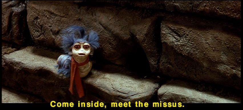 [Sarah] Did you say "hello"? [Worm] No, I said "allo," but that's close enough. [Sarah] You're a worm, aren't you? [Worm] That's right. [Sarah] You don't by any chance know the way through this labyrinth? [Worm] Who, me? No, I'm just a worm. [Worm] Come inside, meet the missus. [Sarah] No, thank you, but I have to solve this labyrinth. |