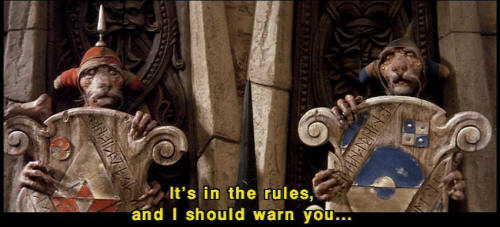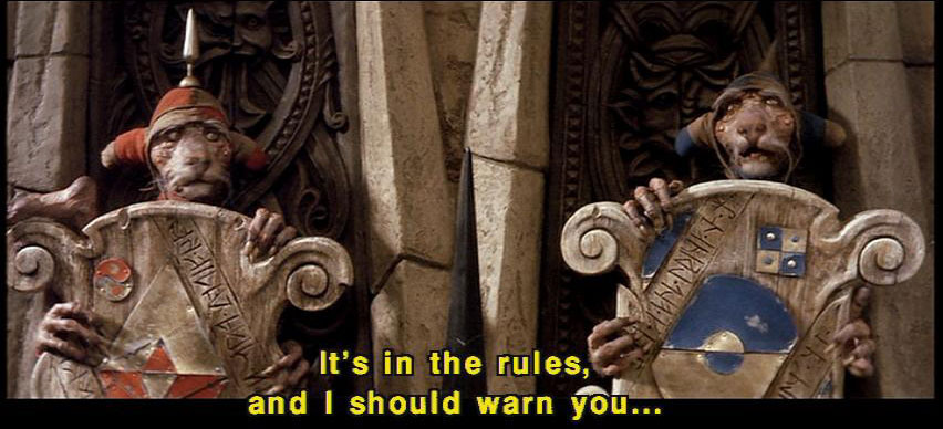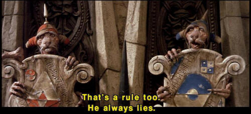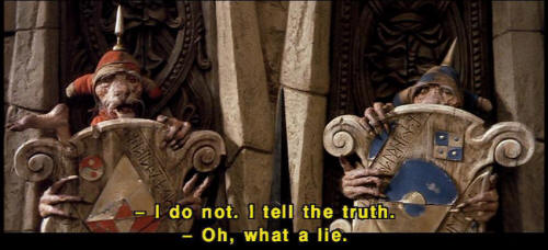 [Shield] We don't know. [Shield] But they do. [Sarah] Oh. Then I'll ask them. [Shield] No, you can't ask us. You can only ask one of us. [Shield] It's in the rules, and I should warn you ... [Shield] one of us always tells the truth ... [Shield] and one of us always lies. [Shield] That's a rule too. He always lies. [Shield] I do not. I tell the truth. [Shield] Oh, what a lie. |