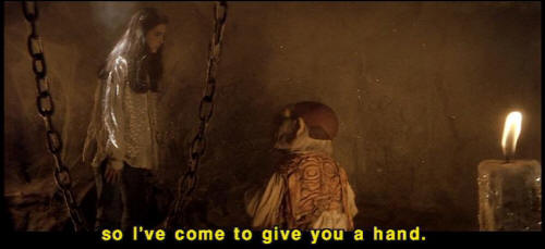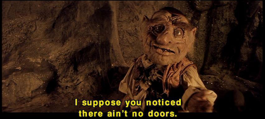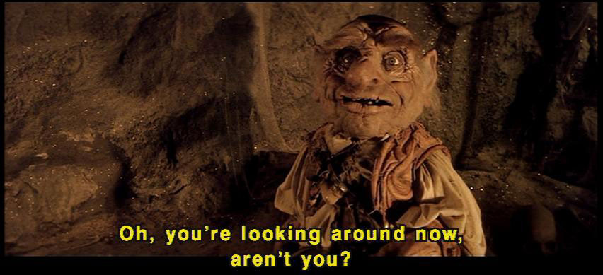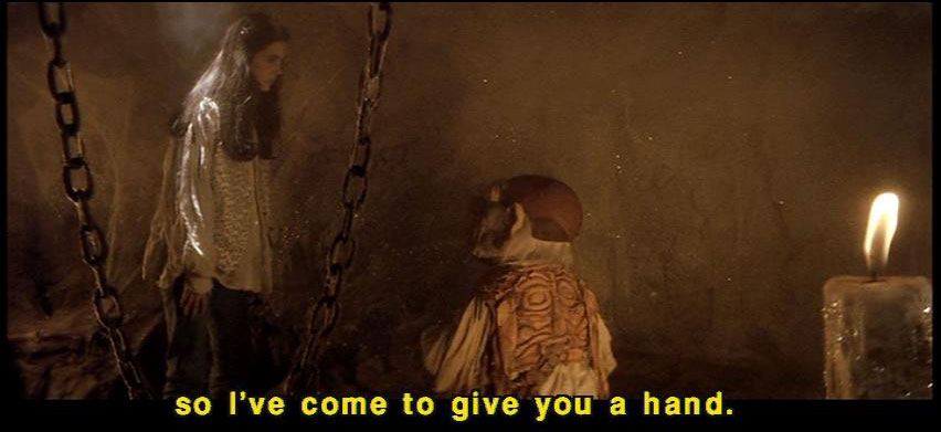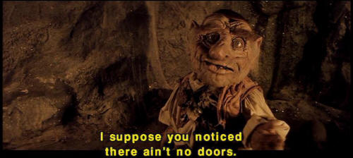 [Sarah] Oh, it's you. [Hoggle] Oh, yes, well ... [Hoggle] I knew you were gonna get into trouble as soon as I met you ... [Hoggle] so I've come to give you a hand. [Hoggle] Oh, you're looking around now, aren't you? [Hoggle] I suppose you noticed there ain't no doors. [Hoggle] Only the hole. [Hoggle] This is an oubliette. The labyrinth's full of them. |