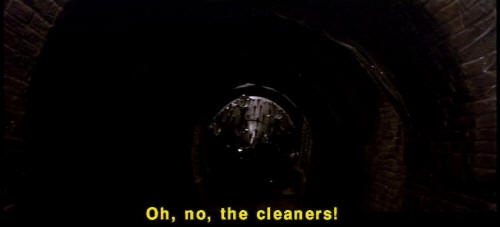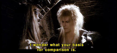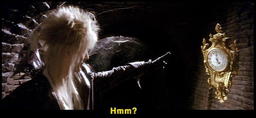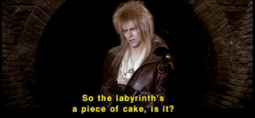 [Jareth] Hmm? [Sarah] That's not fair! [Jareth] You say that so often. [Jareth] I wonder what your basis for comparison is. [Jareth] So the labyrinth's a piece of cake, is it? [Jareth] Well, let's see how you deal with this little slice. [Hoggle] Oh, no, the cleaners! |